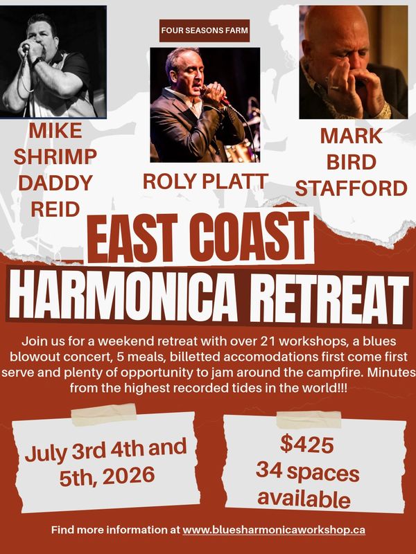 No matter your level come learn and study harmonica with three of Canada’s premier blues harmonica players. Mike "Shrimp Daddy" Reid, Mark "Bird" Stafford and Roly Platt. 21 workshops will be offered over 3 days along with 5 meals, camping, billeting and limited accommodations. $425. E-mail kevin@fourseasonsfarm.ca to register or call 902-769-7920.